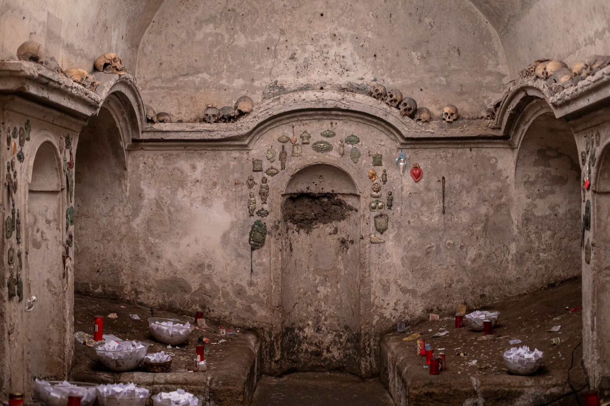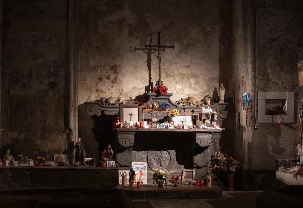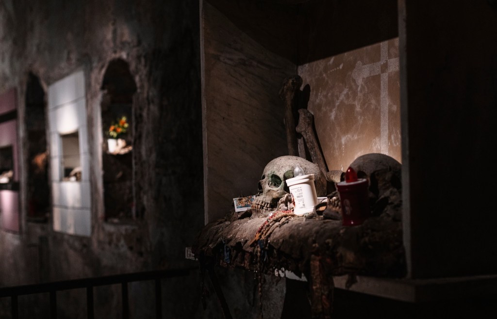 Nella parte sotterranea — detta “chiesa delle anime pezzentelle” — i fedeli pregavano per le anime dimenticate, adottando i teschi custoditi negli altari in cambio di protezione. È uno dei pochi luoghi dove il confine tra fede e superstizione si fa sottile: un santuario di luce e ombra, in cui la morte diventa parte della vita quotidiana napoletana.