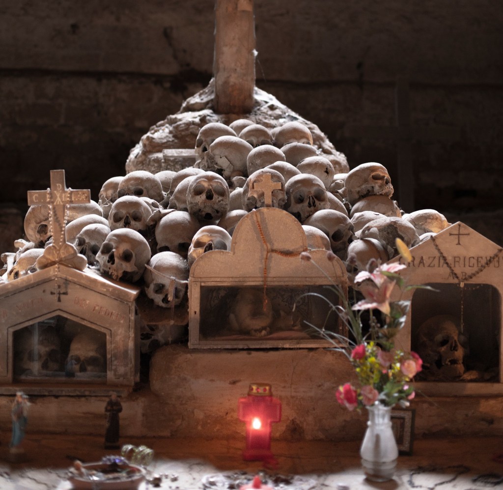 La sua facciata è inconfondibile: nicchie ospitano teschi e ossa incorniciati come reliquie