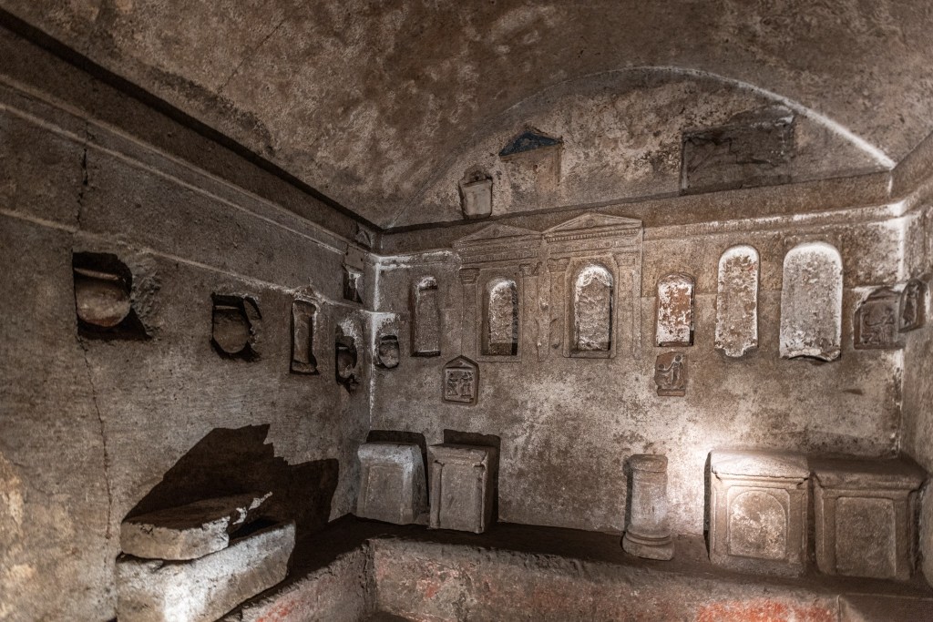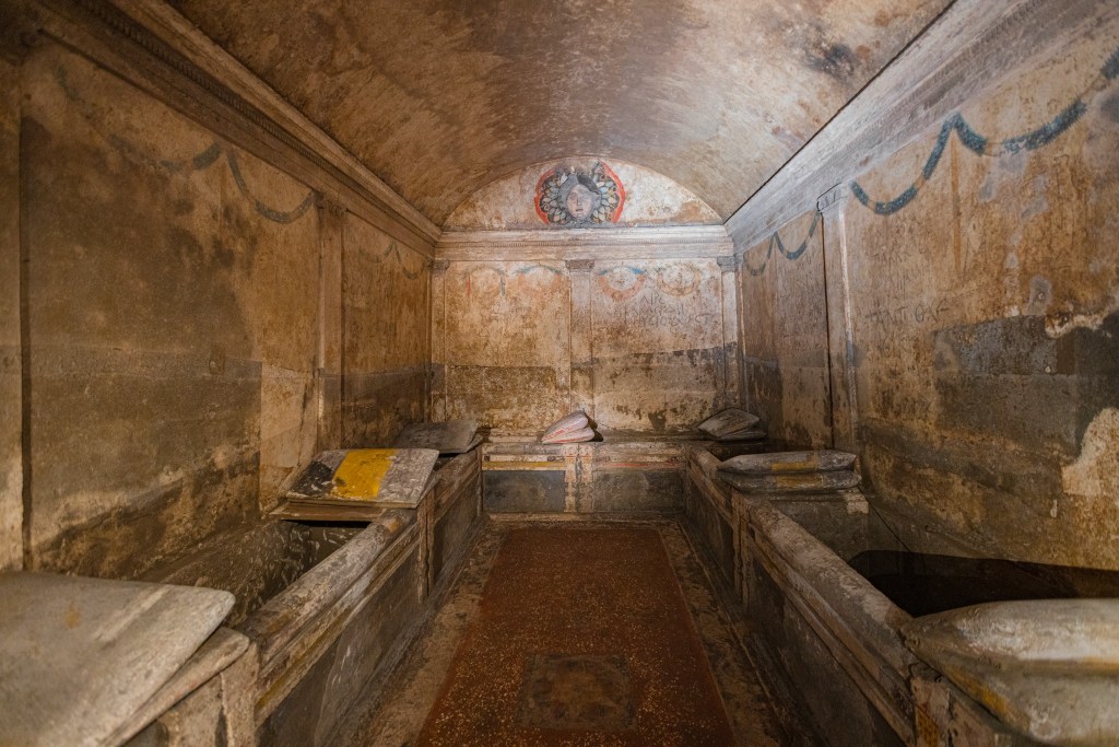 Oggi, le volte di tufo, gli arcosoli scolpiti e i corridoi umidi raccontano secoli di fede e di mistero: qui l’arte antica dialoga con la spiritualità più profonda, e nel silenzio sembra ancora di percepire le voci di chi cercava, tra queste pietre, la via verso l’eternità.