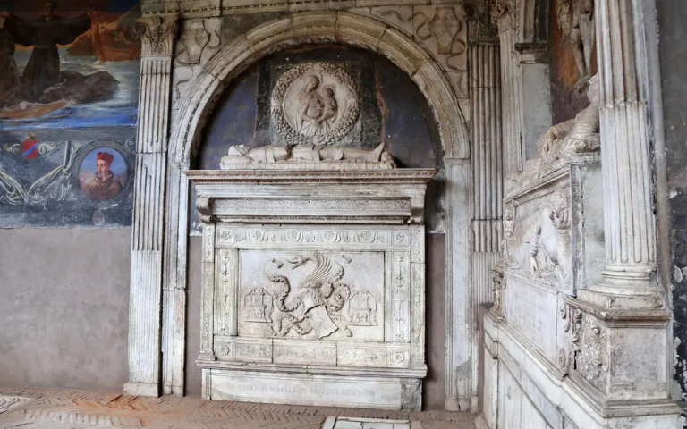 Nel chiostro minore di Santa Maria la Nova, si trova un antico sepolcro che da tempo suscita curiosità e leggende: la cosiddetta tomba di Dracula. Alcuni studi ipotizzano un possibile legame con Vlad Țepeș, il principe valacco da cui deriva il mito di Dracula, ma non esistono conferme certe. Tra iscrizioni enigmatiche e simboli misteriosi, il luogo continua ad attirare chi è affascinato dal lato più oscuro della città.