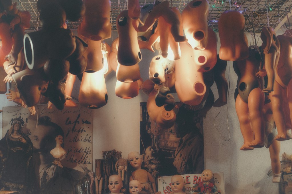 All’Ospedale delle Bambole di Napoli, questa sensazione si fa quasi tangibile, senza mai esagerare: le pareti delle stanze sono tappezzate di bambole antiche e pezzi di bambole smontate, mentre altri corpi e teste pendono dal soffitto, creando un’atmosfera sospesa tra meraviglia e inquietudine.